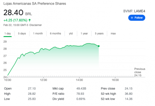 Além desse, existe mais um exemplo claro que está acontecendo bem debaixo dos seus olhos. E ele foi alertado por Felipe Miranda nas suas “10 previsões para 2021”. É o caso de LAME4 (Lojas Americanas) e da possível fusão com a B2W. Com a notícia da possível fusão entre as companhias, as ações da gigante do varejo simplesmente disparam no pregão. Mesmo com PETR4 caindo 20%, LAME4 está subindo mais de 18%
