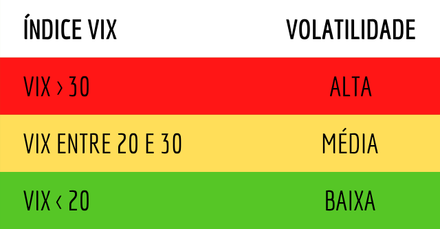 O VIX (Volatility Index) mede, em tempo real, a volatilidade dos ativos na Bolsa de Valores dos Estados Unidos. Este índice é calculado automaticamente pela CBOE (Chicago Board Options Exchange) e é dividido em três classificações: baixa, média e alta. Quando o índice é menor que 20, a volatilidade é baixa. Já quando está entre 20 e 30, é classificada como média, e, se maior que 30, é alta.