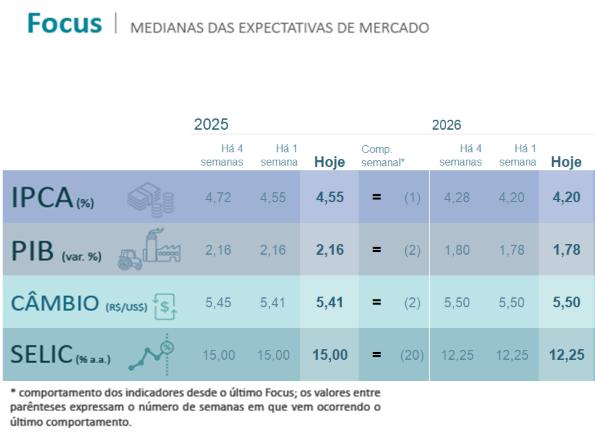O relatório Focus da última segunda-feira (10) já reflete tal expectativa – apontando para um IPCA acumulado de 4,2% (menor que o atual), além de uma Selic terminal de 12,25%, ao final de 2026.