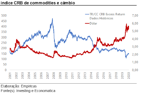Como podemos observar no gráfico abaixo, há historicamente uma correlação inversa do preço desses insumos com o câmbio e, apesar da recuperação notável ao fim de 2020 do índice de commodities, estamos ainda muito longe do seu pico.