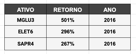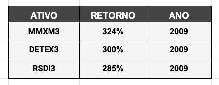 - Os maiores retornos da Bolsa apresentaram, apenas em 2020, multiplicações na ordem de +319%, +231% e +210%.