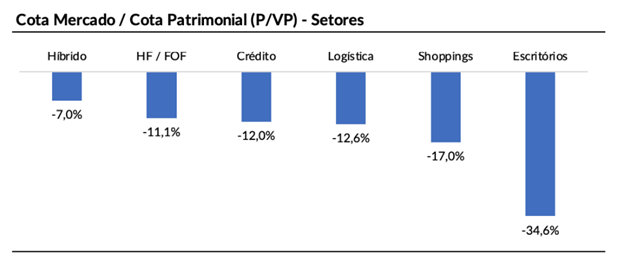 “Ao lado deste fator de incerteza, é preciso citar que as cotas dos FIIs seguem com descontos atualmente. Em alguns segmentos do Ifix, como shoppings e escritórios, todos os integrantes negociam com P/VP abaixo de 1”, afirma o analista.