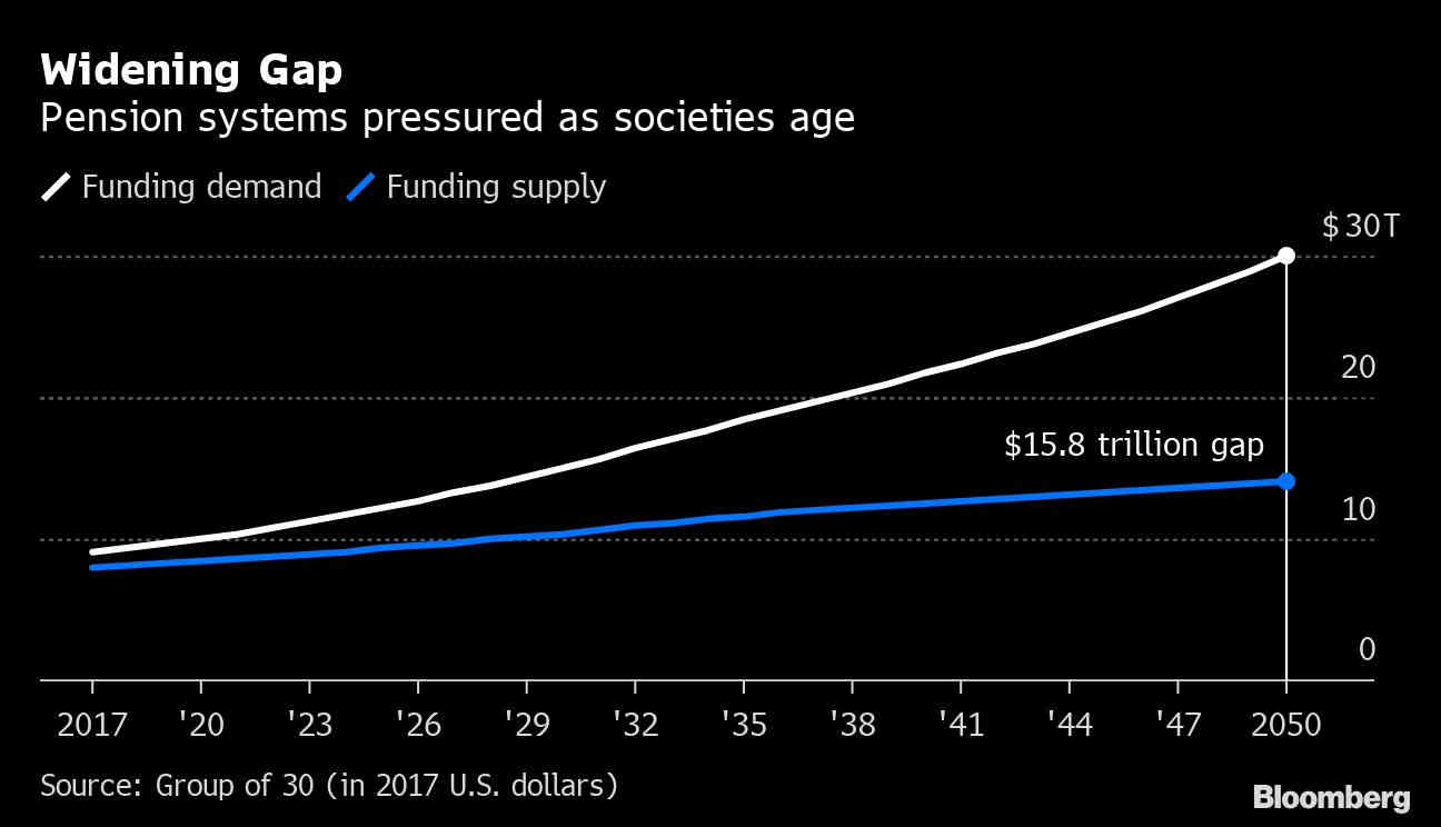 O G-30, que inclui o presidente do Banco da Inglaterra, Mark Carney, e os ex-secretários do Tesouro dos EUA Timothy Geithner e Lawrence Summers, culpou principalmente os antiquados sistemas de pensão e aposentadoria pelo enorme déficit de financiamento, que somou US$ 1,2 trilhão em 2018. A estimativa de retornos menores de poupança – em uma era de baixas taxas de juros – agrava o problema.