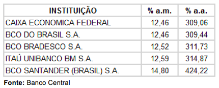 Segundo dados do Banco Central, no período de 10/10/2017 a 17/10/2017, a taxa média cobrada no cheque especial nos principais bancos brasileiros foi de 12,96% ao mês, conforme tabela abaixo: