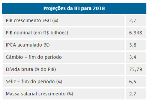 O crescimento do Produto Interno Bruto (PIB) em 2018 deverá ser de 2,7%, segundo previsão da Instituição Fiscal Independente (IFI) do Senado, em relatório mensal apresentado nesta segunda-feira (19). A previsão anterior era de 2,3%. O documento traz atualizações das estimativas para curto, médio e longo prazos. Além disso, segundo o estudo, a ampliação da massa de salários e a queda da taxa de juros e do comprometimento de renda sustentam uma perspectiva de aceleração do crescimento econômico para este ano.