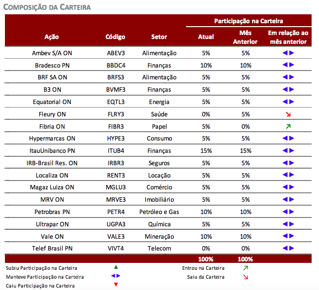No caso da carteira recomendada, composta por 16 papéis, o analista Alexandre Marques Filho optou por substituir as ações de Fleury (FLRY3) por Fibria (FIBR3). A seleção da corretora subiu 11,42% em janeiro, ante alta de 11,14% do Ibovespa.