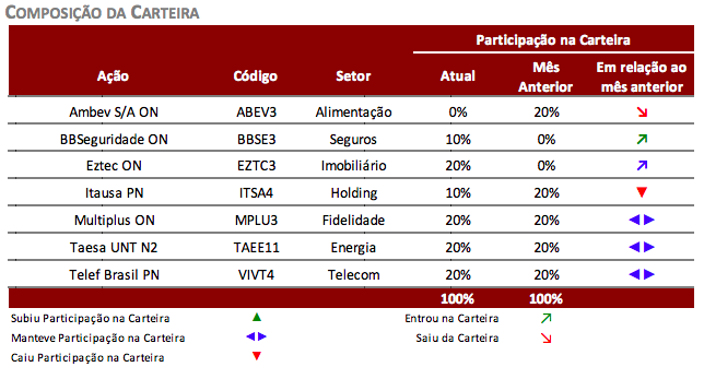 Já no portfólio de seis ações com “pagamento consistentes de dividendos”, houve saída de Ambev (ABEV3) e entrada de BB Seguridade (BBSE3) e Eztec (EZTC3). Além disso, caiu o peso de Itaúsa (ITSA4) de 20% para 10%. Em janeiro, a Carteira Dividendos Elite rendeu 5,97%.