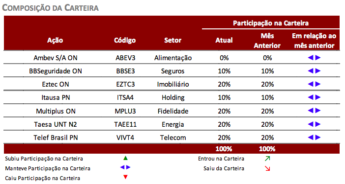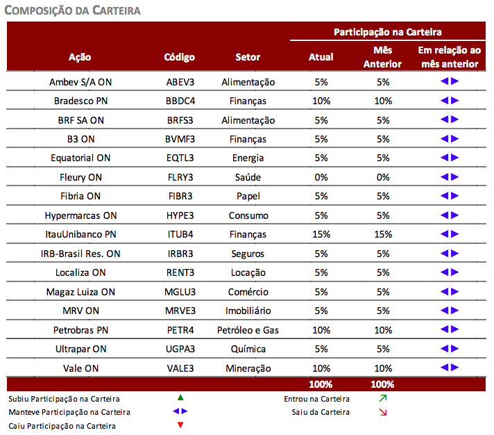 A carteira recomendada, composta por 16 papéis, subiu 1,24% em fevereiro, ante alta de 0,52% do Ibovespa. O maior peso é de Itaú Unibanco (ITUB4), com 15%.