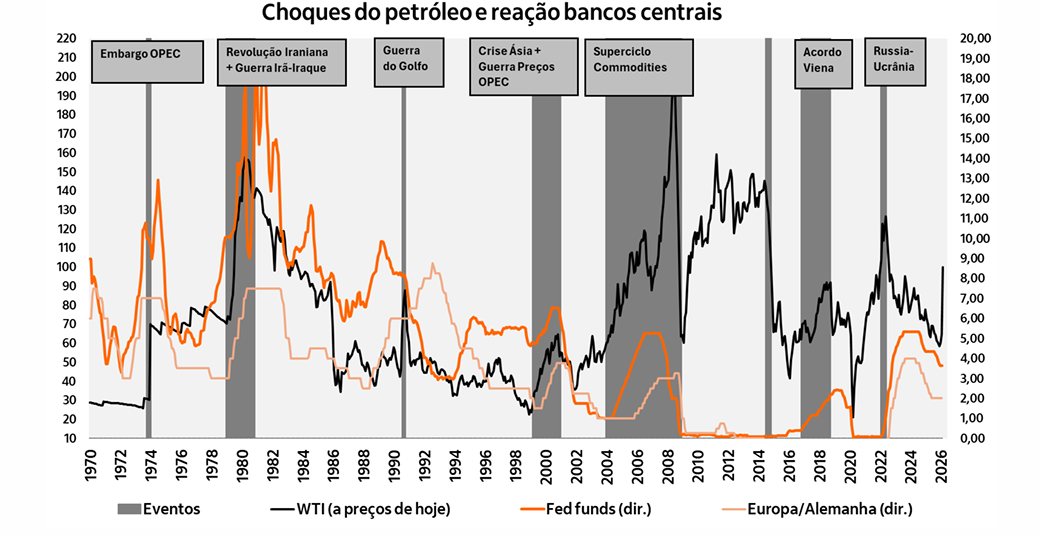 Um gráfico apresentado pelo banco mostra que, historicamente, choques de petróleo — como o observado após a guerra na Ucrânia — costumam ser seguidos por ciclos de alta de juros, refletindo o impacto disseminado da energia sobre a inflação.
