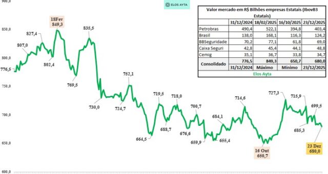 Após o fundo de outubro, o mercado ensaiou uma reação. Houve recuperação ao longo de novembro, com o valor consolidado voltando à casa dos R$ 727 bilhões, mas o movimento perdeu força em dezembro. No fechamento de 23 de dezembro, o conjunto das estatais estava avaliado em R$ 680,0 bilhões.