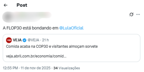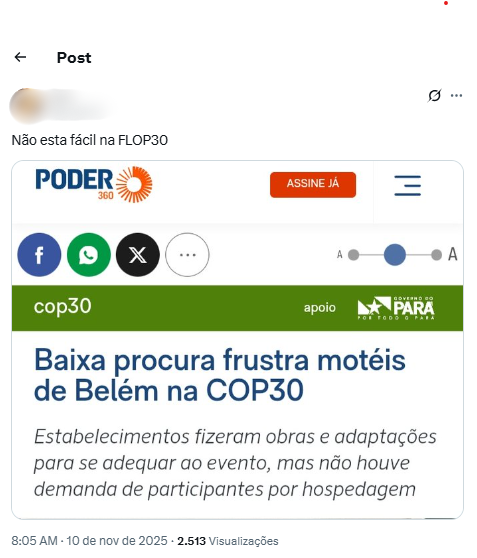 Críticos do governo Lula aproveitaram o quórum reduzido de líderes para apelidar a COP30 de “FLOP30” nas redes sociais. “Flop” é uma expressão em inglês que significa “fracasso”.