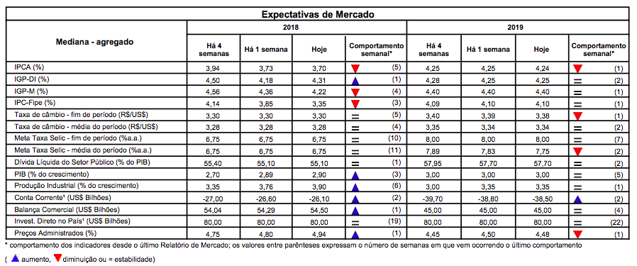 A estimativa para a Selic, por sua vez, foi mantida em 6,75% ao ano para o fim de 2018 e em 8% ao ano para o fim de 2019.