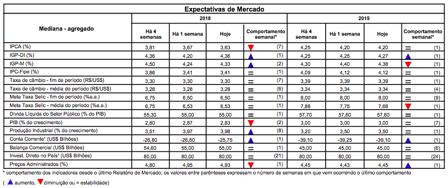 Em semana de decisão do Comitê de Política Monetária do Banco Central sobre o juro básico brasileiro, a estimativa para a Selic seguiu em 6,50% ao ano para o fim de 2018 e em 8% ao ano para o fim de 2019. Atualmente, a Selic se encontra no patamar de 6,75% ao ano.