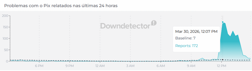 Segundo dados do site Downdetector, que monitora serviços online, as queixas com relação ao não funcionamento do Pix começaram por volta das 11h22 (horário de Brasília) e atingiram o pico às 12h07, com 172 reclamações.