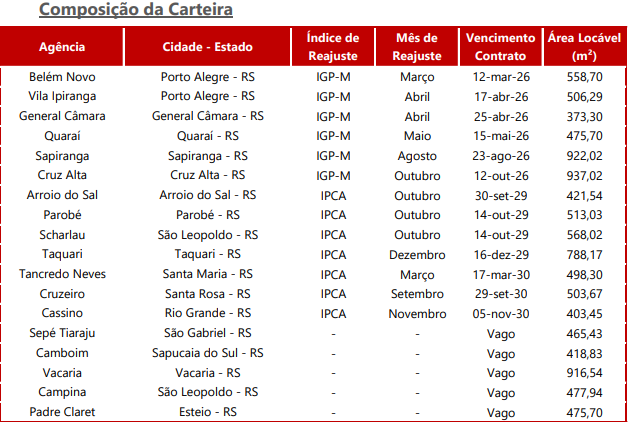 Atualmente, o fundo possui 18 agências bancárias em sua carteira imobiliária, todas localizadas no estado do Rio Grande do Sul.