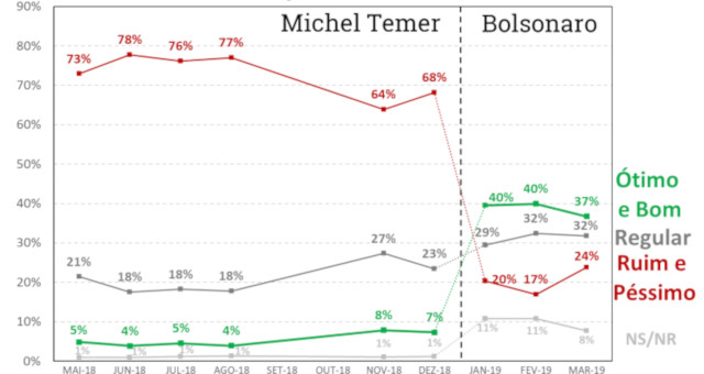 A XP Investimentos publicou pesquisa mensal de política, na qual aponta piora na percepção da população em relação ao governo de Jair Bolsonaro: o número de respondentes que avaliam o mandato como “bom” ou “ótimo” caiu 30 pontos-base, passando de 40% para 37%. Por sua vez, os que consideram a administração “ruim” ou “péssima” subiu de 17% para 24%. Já 32% dos entrevistados consideram a gestão como “regular” – mesmo percentual de fevereiro.