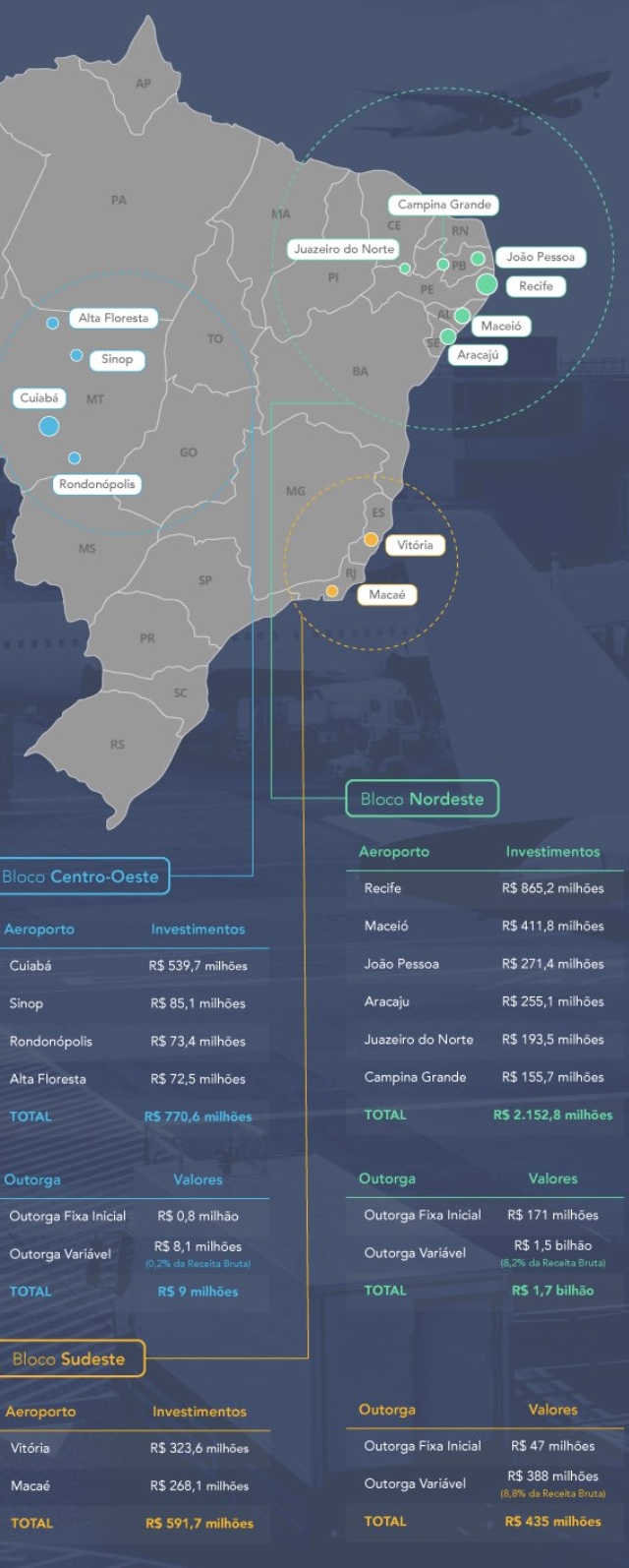 O leilão contemplará os aeroportos nordestinos de Recife, Maceió, Aracaju, Juazeiro do Norte, João Pessoa, Campina Grande. No Sudeste, serão leiloados os aeroportos de Macaé e Vitória.