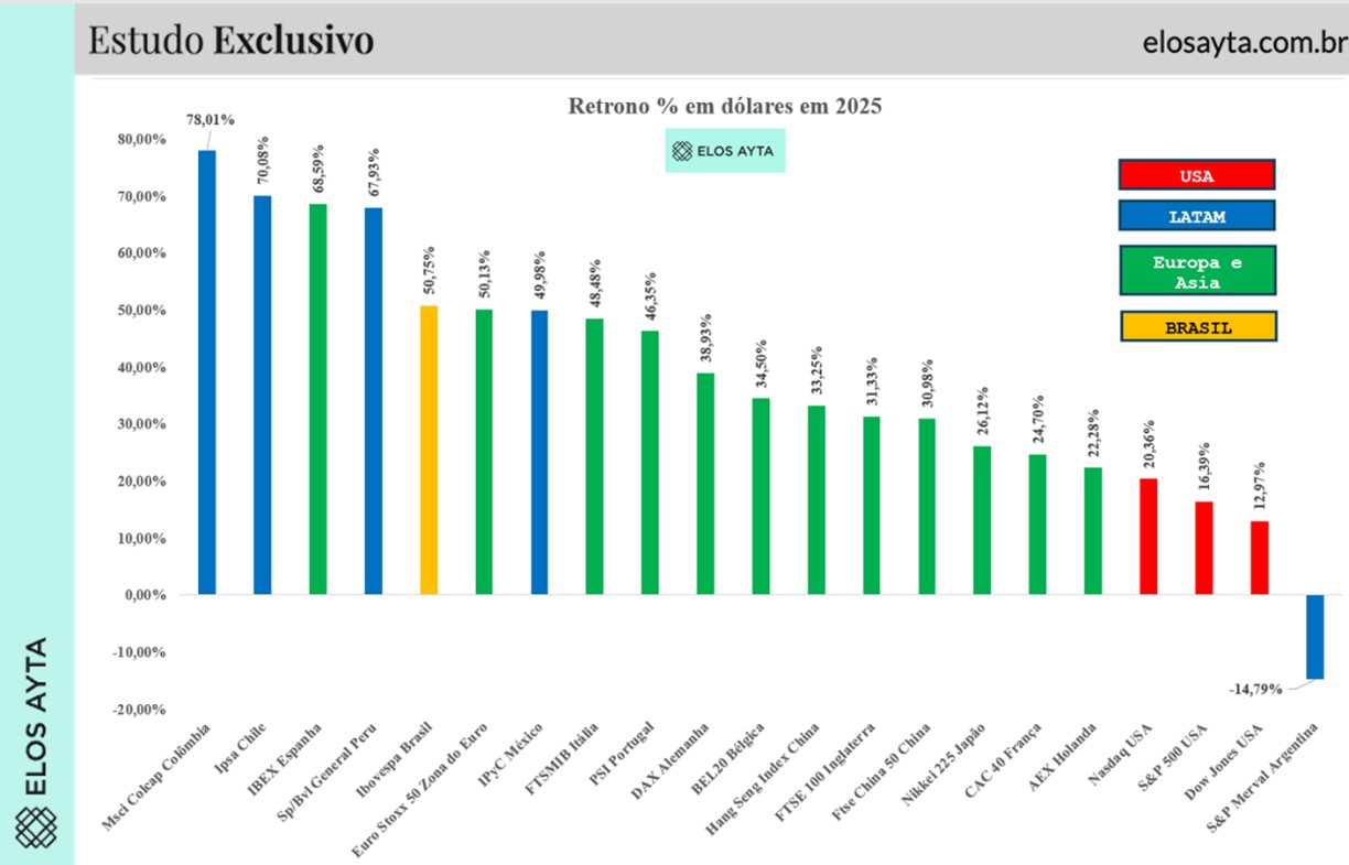 Levantamento da Elos Ayta, que acompanha o desempenho de 21 dos principais índices globais, mostra que 2025 foi especialmente favorável às bolsas da América Latina. O melhor resultado do ano em dólares ficou com o MSCI Colcap, da Colômbia, que avançou 78,01%. Em seguida aparecem o IPSA, do Chile, com alta de 70,08%, e o BVL General, do Peru, com valorização de 67,93%.