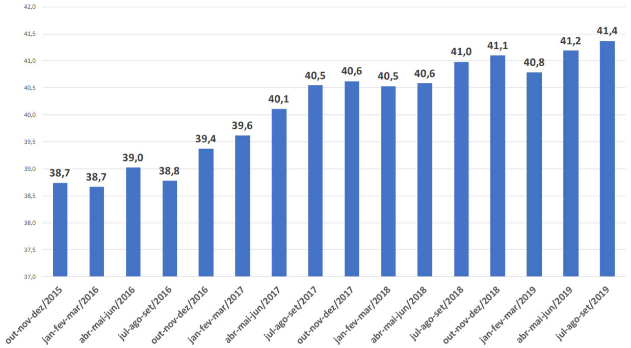 A pesquisa também indica a diminuição contínua da proporção da população ocupada que contribui para a Previdência Social, que passou de 62,8% no trimestre terminado em junho para 62,3% no período terminado em setembro, somando 58,5 milhões de pessoas. No mesmo período de 2018, a taxa era de 63,7%.