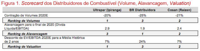 Nessa comparação, a Ultrapar e a Cosan apresentaram um prêmio de 7%, cada, do múltiplo previsto para 2020, sobre a média do último biênio. Já a BR Distribuidora é negociada com prêmio de 24%.