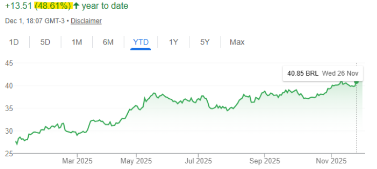 Conforme explica a instituição financeira, os papéis do Itaú permaneceram na carteira por muitos meses e apresentaram um resultado bastante robusto ao longo do ano. No acumulado de 2025, as ações ITUB4 avançaram 48,61%, de acordo com dados do Google Finance: