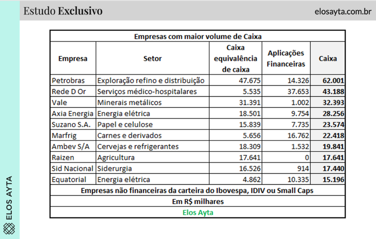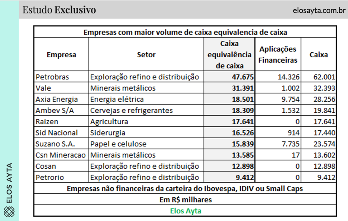 Na terceira tabela, que destaca o volume de caixa e equivalência de caixa, os nomes voltam a convergir: Petrobras, Vale, Ambev, Axia Energia. Aqui, o diferencial é a liquidez de curtíssimo prazo, valores mantidos muito próximos do caixa operacional.
