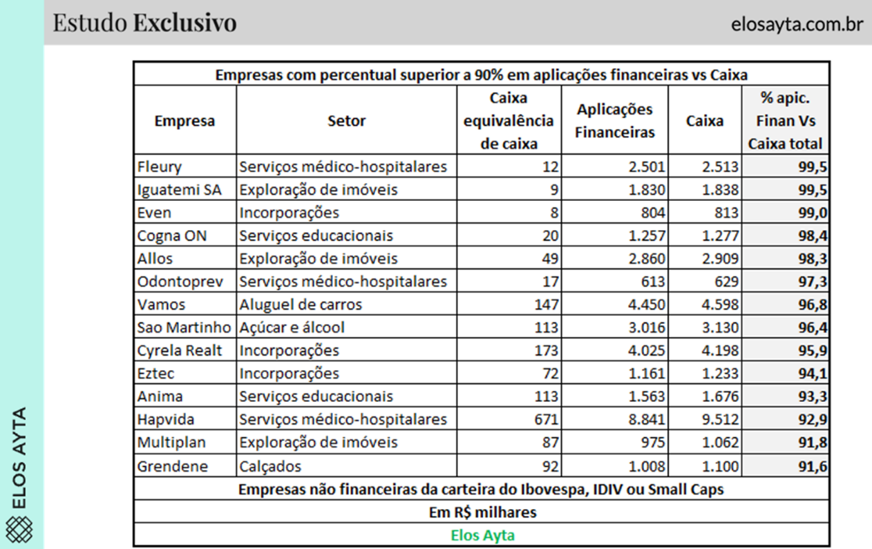 A quarta tabela, talvez a mais reveladora, traz empresas cujo caixa é praticamente todo convertido em aplicações financeiras, casos como Fleury, Iguatemi, Cogna e Allos, com índices acima de 98%.