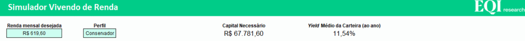 Embora R$ 312,89 pareça pouco, este montante pode acelerar a sua construção de renda passiva e ainda gerar um retorno de até R$ 67 mil em 10 anos. Para chegar nesse resultado, usamos o simulador “Vivendo de Renda” da EQI Research.