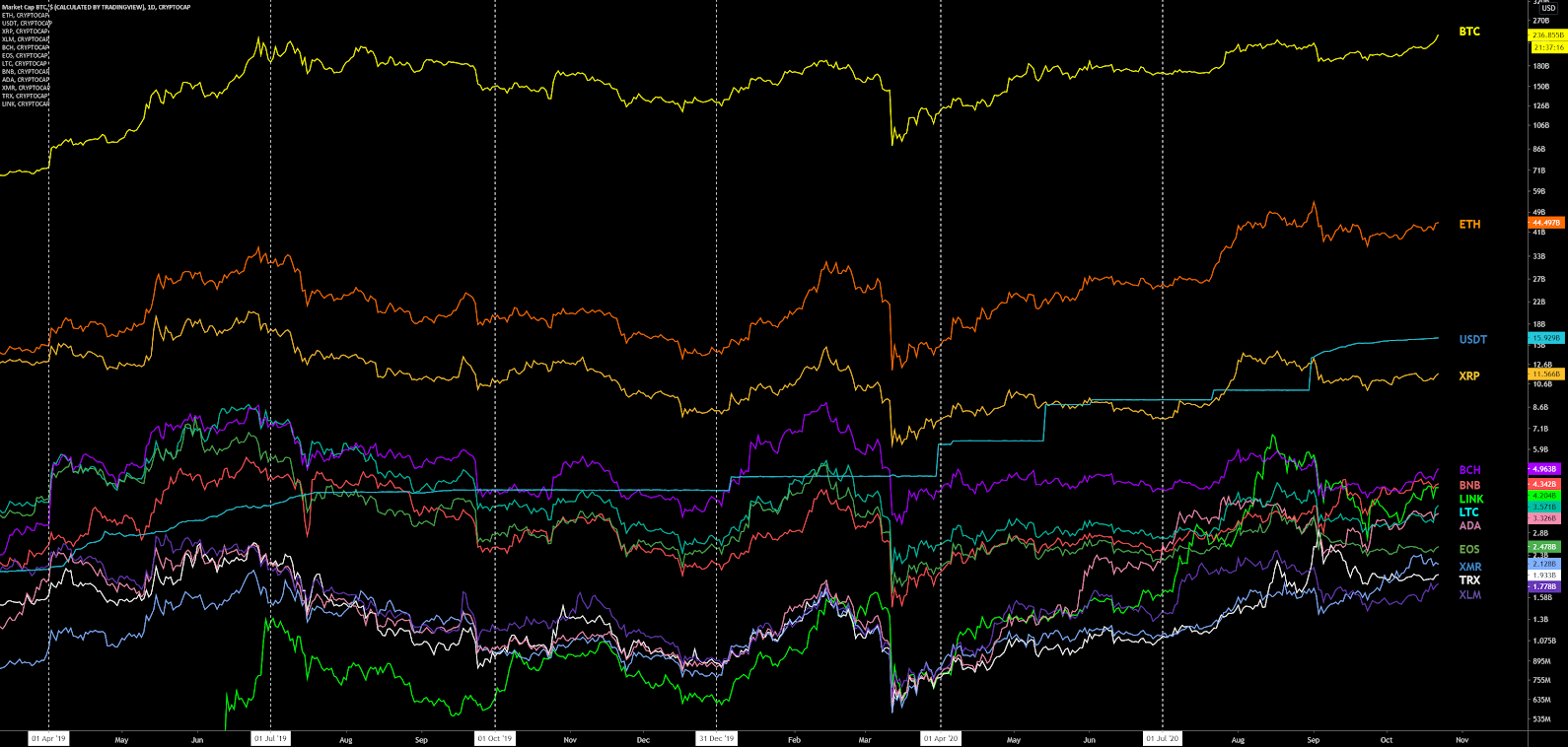 Nos últimos meses, essas correlações diminuíram drasticamente e ether teve um melhor desempenho do que outros ativos, exceto por ADA e LINK. Essas correlações tendem a diminuir em um mercado de alta e aumentar em um mercado de baixa.