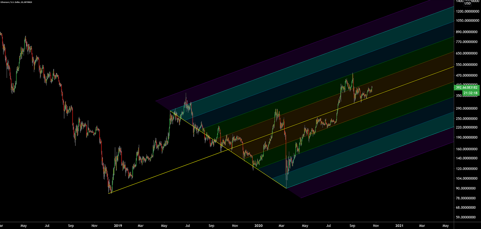 Esse mercado provavelmente estabeleceu um novo pitchfork de alta. Quando essa tendência for definida, o preço à vista continuará tentando retornar à linha mediana (linha amarela), atualmente a US$ 343.