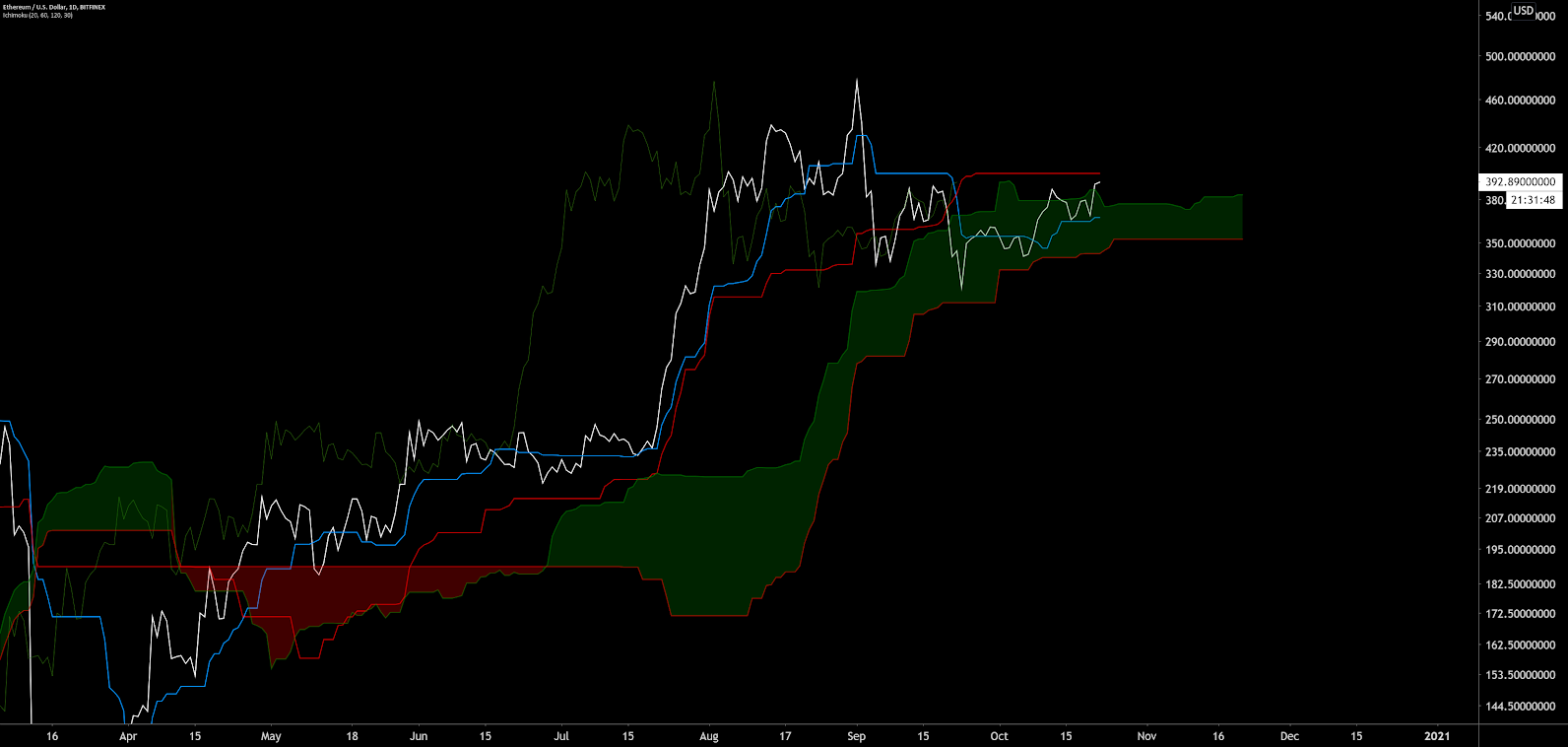 Por fim, no gráfico de dois dias para ETH/BTC, indicadores de tendência estão positivos, pois o preço está acima das MMEs de 50 dias e 200 dias, bem como acima da Nuvem.