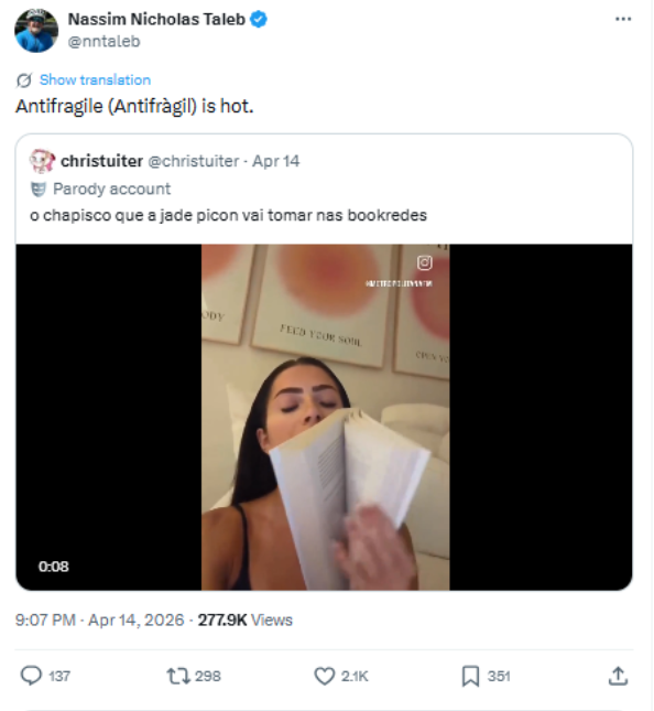 Em seu X, antigo Twitter, Taleb escreveu: “Antifragile is hot”, que poderia ser traduzido de diferentes maneiras, como ‘Antifrágile está em alta’ ou é ‘quente’.
