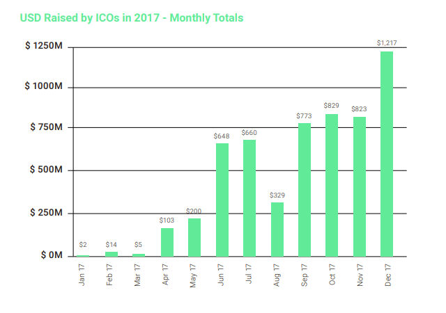 De acordo com um relatório emitido pela empresa VC FabricVentures e pela TokenData, com base em suas métricas, foram arrecadados mais de US$ 5,6 bilhões em 2017. “Isso se compara a US$ 1 bilhão de um empreendimento ‘tradicional’ investindo em startups de blockchain no mesmo período de tempo e ‘meros’ US$ 240 milhões levantados pelas vendas de tokens em 2016”, continua o relatório.
