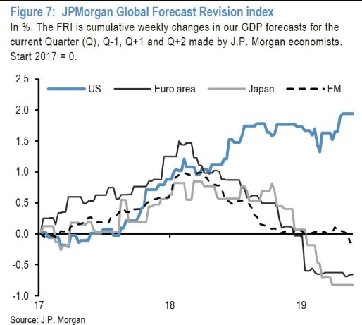Diante das discrepâncias entre 2018 e 2019, o JPMorgan pondera que a diferenciação mais importante é a queda dos yields de Treasuries, ao invés de tendência de alta. Panagirtzoglou lista as três principais diferenças entre 2018 e 2019: yields de títulos recuam ao invés de subirem; fluxo de repatriação das empresas nos EUA está reduzido e; existe menor diferença de crescimento entre os EUA e as outras economias do mundo.