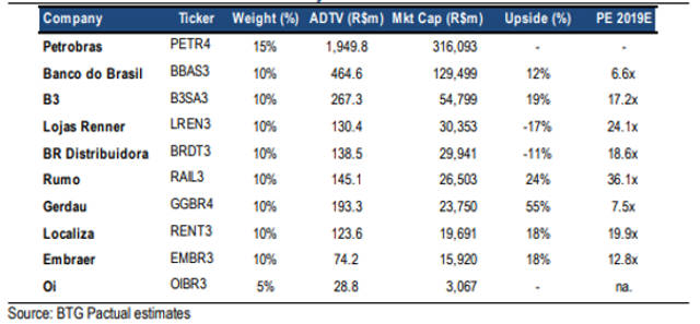 O BTG Pactual continua com uma postura positiva em relação às ações brasileiras e com a visão de que o Ibovespa está relativamente barato (negociando abaixo da média histórica) e com baixas alocações por estrangeiros e locais. Isso em um cenário em que a recuperação econômica do Brasil deve (finalmente) acelerar em 2019.
