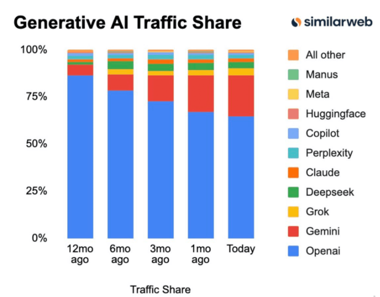 A participação de mercado da Gemini atingiu 22%, um aumento em relação aos 19,5% de apenas um mês atrás e aos 13,3% de três meses atrás.