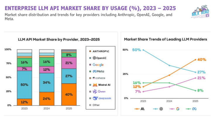 - Em 2025: a participação da OpenAI despencou para 27%. Já a da Anthropic (Orange) disparou para 40%.