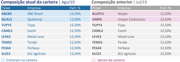 Para a carteira Small Caps 8+, a corretora optou por substituir duas ações. Com isso, saíram Alupar (ALUP11) e Unipar (UNIP6) e entraram ABC Brasil (ABCB4) e Qualicorp.