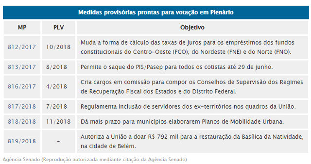 Chegaram ao Senado na quinta-feira (24) os PLVs 7/2018 e 11/2018 e a MP 819/2018, mas a pauta já estava trancada pelos PLVs 4, 8 e 10/2018 (confira quadro abaixo). Todas essas propostas só têm vigência até a próxima sexta-feira (1º). O presidente do Senado, Eunício Oliveira, afirmou à imprensa nesta sexta-feira (25) que o plenário pode votar as MPs rapidamente se houver necessidade e entendimento entre as lideranças da Casa.