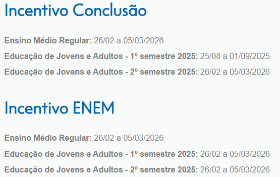 Para estudantes do 1º, 2º e 3º anos que concluírem a etapa e participarem do Enem 2025, o pagamento será feito entre 26 de fevereiro e 5 de março de 2026.