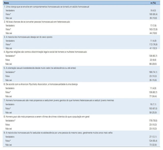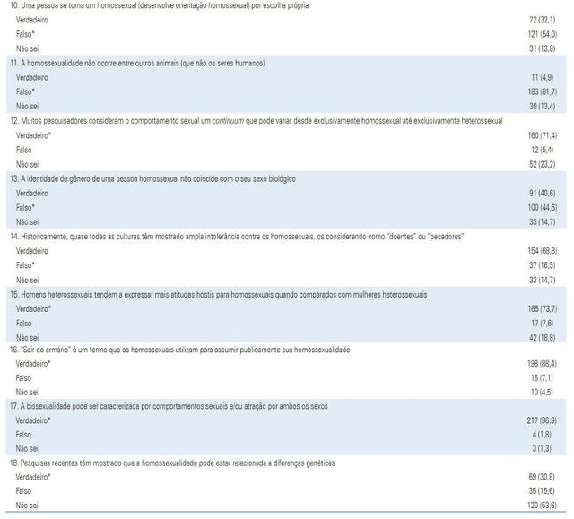Um total de 34,4% dos entrevistados não soube responder se a homossexualidade era doença (item 6), 4,9% responderam que sim. O item 10, que afirmava que uma pessoa se torna homossexual por conta própria, foi considerado verdadeiro por 32,1% dos médicos, e 13,8% não souberam responder. “Essa resposta revelou que quase metade dos médicos desconhecia os vários aspectos biopsicossociais relacionados à homossexualidade e a atribuía simplesmente a uma escolha feita pelo indivíduo”, escreveu o grupo de cientistas.