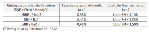 O custo para a manutenção da linha de crédito compromissada sem utilização (taxa de comprometimento) e para um eventual saque (custo de financiamento) serão impactados pelo rating corporativo da companhia: