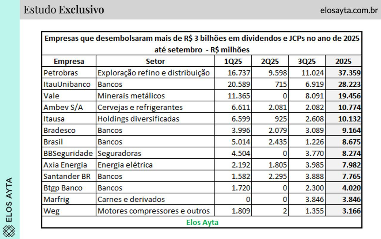 A Elos Ayta destaca que 13 companhias listadas na B3 ultrapassaram a marca de R$ 3 bilhões em pagamentos neste ano, considerando valores efetivamente desembolsados em 2025, mesmo quando relacionados a resultados de trimestres anteriores.