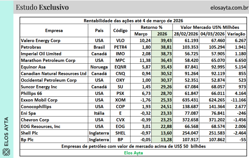Um levantamento da consultoria Elos Ayta com 16 companhias globais de petróleo, todas com valor de mercado superior a US$ 50 bilhões e ações ou ADRs negociadas em Nova York ou na América Latina, revela que a Petrobras aparece entre os maiores destaques do setor em 2026.