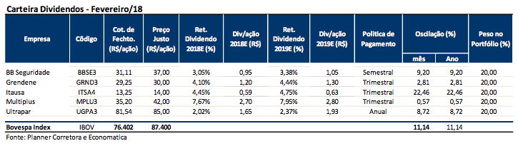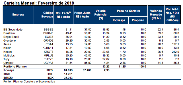 Em relação à carteira de janeiro, a Planner decidiu retirar Itaú (ITUB4), M. Dias Branco (MDIA3), Fleury (FLRY3), Multiplan (MULT3), Ser Educacional (SEER3) e Telefônica Brasil (VIVT4) para dar lugar às ações de BB Seguridade (BBSE3), Grendene (GRND3), Itaúsa (ITSA4), Kroton (KROT3), Multiplus (MPLU3) e Tupy (TUPY3).