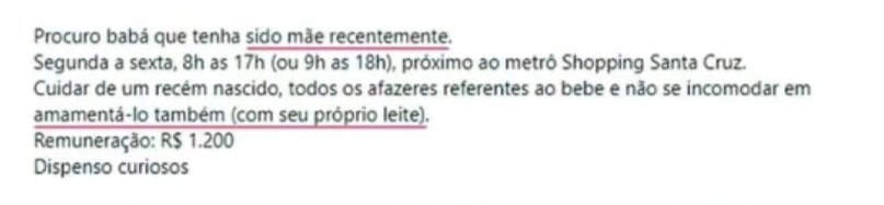 Outra questão delicada é a exigência de que a babá tenha sido mãe recentemente, o que viola o direito à licença-maternidade. Há também um abuso ético na vaga: a babá teria que amamentar a criança, prática abusiva e sem respaldo legal.