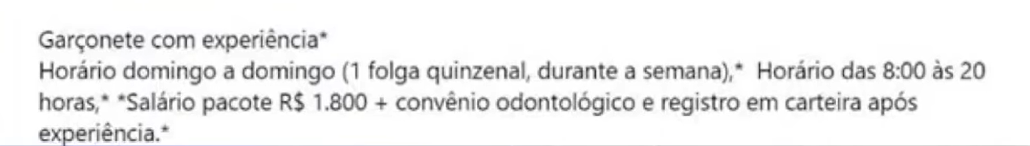 O anúncio foi divulgado em maio, mas atraiu atenção na internet nas últimas semanas e recebeu críticas nas redes sociais. Tratava-se de um emprego no regime CLT, com expediente das 14h às 22h – sem descanso nos fins de semana e feriados – e salário de R$ 1.800 por mês.