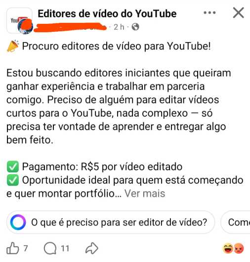 O valor pago por cada edição – trabalho que costuma levar horas – surpreende: apenas R$ 5. Essa vaga freelancer foi compartilhada em um fórum da internet e os comentários são divertidos. Uma reação foi: “não paga nem a luz gasta para processar o vídeo”. Outra pessoa comentou: “não cobre nem a massa do pastel”.