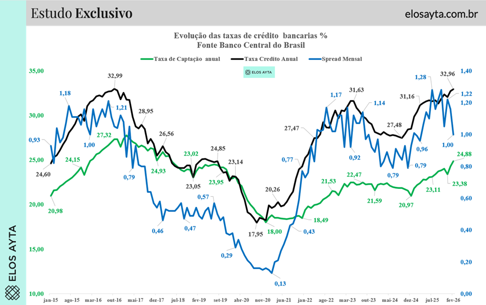O exemplo de fevereiro de 2026 sintetiza esse comportamento: mesmo com custo de captação em 24,88%, a taxa média de crédito segue próxima de 33%.