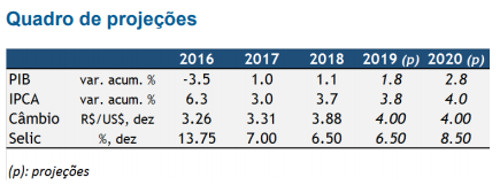 “Esse quadro de menor vigor da recuperação da atividade (que produz um fechamento mais lento do chamado hiato negativo do PIB) certamente gera consequências sobre a evolução da política monetária. Sem maiores pressões inflacionárias no futuro próximo, a elevação da taxa básica de juros (Selic) pode ser adiada. Até então esperávamos o início desse processo no último trimestre de 2019. Agora antevemos o começo do ciclo de alta em 2020”, concluem.
